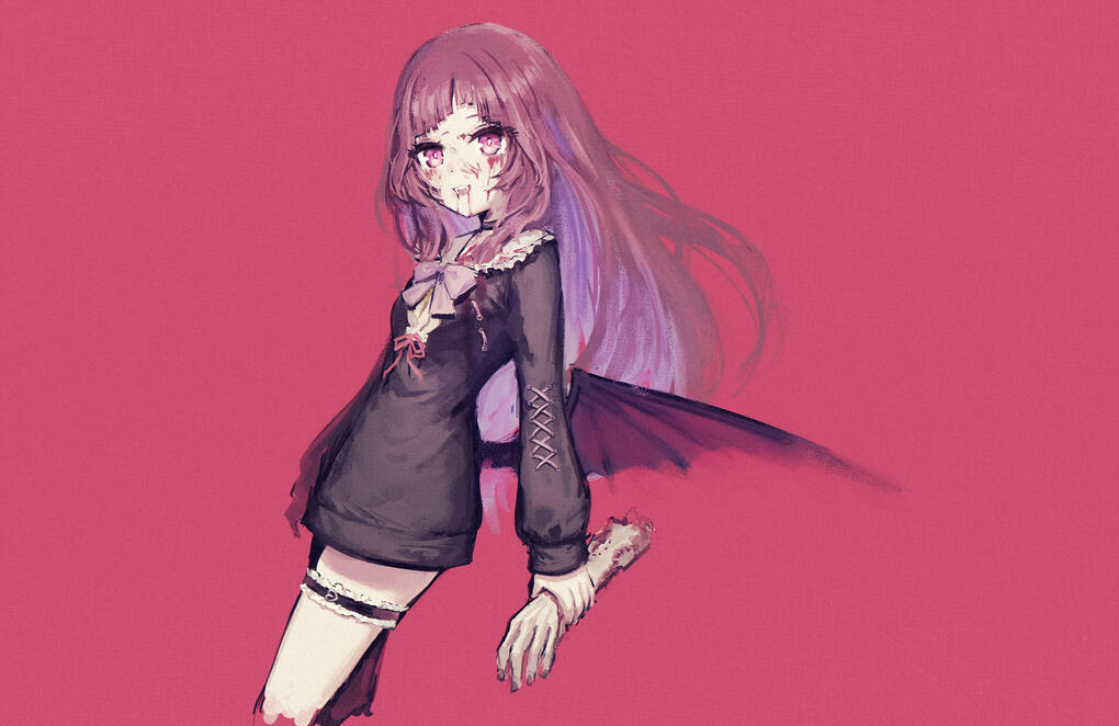 After many years of being a total recluse, Maime decided to put herself out there and went to a goth club one night.She felt too awkward and left the club early in the night. As she left, Maime heard something in the alleyway. There seemed to be banging and rustling within a garbage bin.Maime opened it up to free whatever was inside and out popped a strange cat. The cat gazed upon her and bit her as her reward. Maime returned home feeling very sick...Assuming she had rabies she rushed to urgent care the next morning. However, she left before her appointment because the sun beaming through the windows drove her mad.After several days of sleep, like a metamorphosis, she became a vampire.art: hexundev